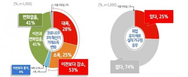 도민은 53%가 지난해 12월부터 올해 1월 사이 가계소득이 코로나19 발생 이전보다 ‘감소했다’고 답했다. 또한 도내 가구 25%는 취업 상태를 유지하기 힘들거나 실직한 가구원이 있는 것으로 조사됐다.