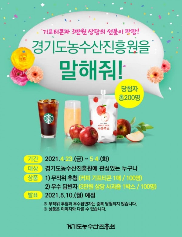 참여자 중 100명에게는 추첨을 통해 커피 기프티콘을 제공한다. 심사를 통해 우수 답변으로 선정된 100명에게는 3만 원 상당의 마켓경기 사과즙 50봉을 선물로 제공한다. 당첨자는 5월 10일 진흥원 누리집과 사회관계망서비스(SNS)에 공지할 예정이다.