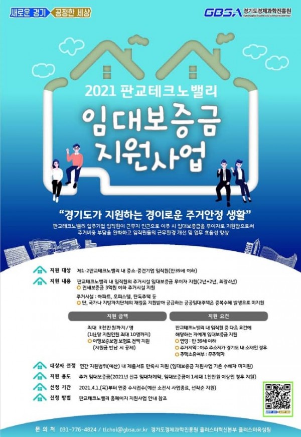 경기도는 판교테크노밸리 내 입주기업 임직원의 주거 안정을 위해 최대 3천만 원을 지원하는 ‘2021년 판교테크노밸리 임대보증금 지원사업’을 추진한다고 1일 밝혔다.