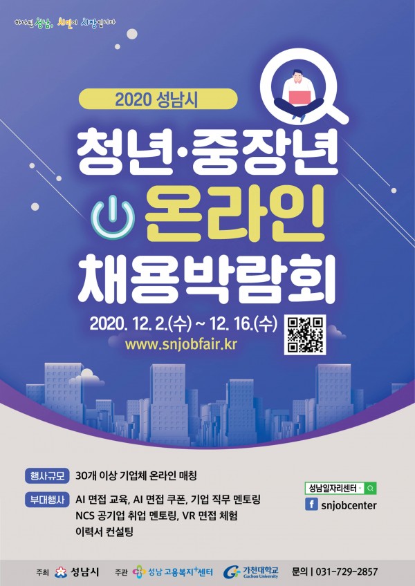 성남시는 코로나19 장기화로 극심해진 취업난 해소를 위해 12월 2일~16일 ‘청년·중장년 온라인 채용박람회’를 개최한다.
