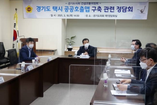 □ 경기도의회 건설교통위원회(위원장 김명원)는 3월 18일(목) 경기도의회 제1정담회실에서 경기도 교통국 택시교통과, 경기도 개인택시조합 및 법인택시조합 관계자들과 함께 ‘경기도 택시 공공호출앱’구축과 관하여 논의하고자 정담회를 개최하였다.