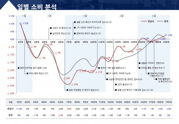 1차 분석 때 최대 마이너스 29%까지 급락했던 소비율은 성남형 연대안전기금 긴급지원 이후 5월 첫째주 마이너스