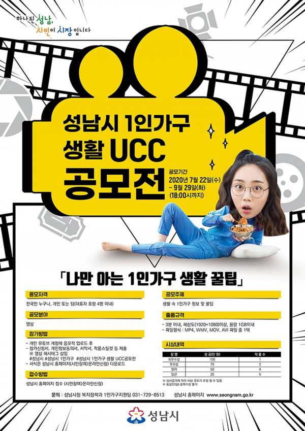 성남시는 오는 9월 29일까지 전 국민을 대상으로 ‘1인 가구 생활 UCC(사용자 제작 콘텐츠) 공모전’을 개최한다.