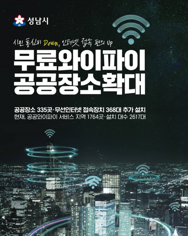 성남시는 무료로 와이파이를 사용할 수 있는 공공장소를 매년 확대해 시민의 통신비를 낮추고 인터넷 접속에 관한 편의를 높이고 있다.