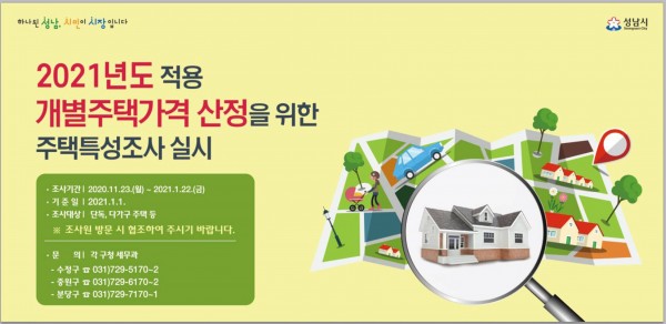 성남시는 오는 11월 23일부터 내년도 1월 22일까지 두 달간 단독, 다가구, 상가주택 등 3만2679호를 대상으로 개별주택가격 특성 조사에 나선다.