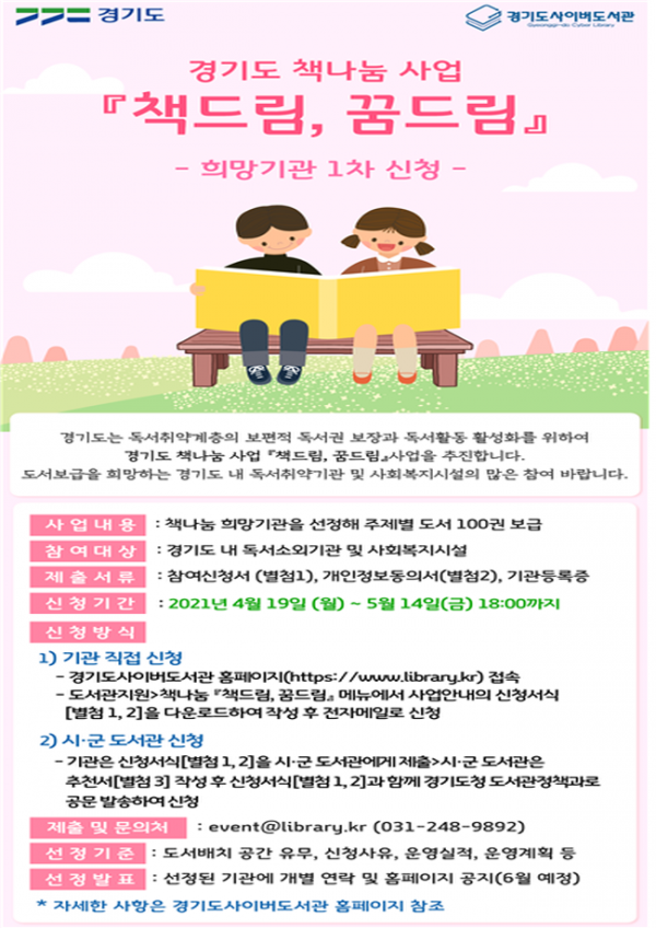 신청 기간은 5월 14일 오후 6시까지며 희망 기관이 경기도사이버도서관 누리집(https://www.library.kr)에 접속해 신청서 작성 후 직접 전자메일(event@library.kr)로 신청하거나, 시·군 공공도서관 추천을 통해 접수하면 된다. 문의사항은 경기도사이버도서관 누리집 공지사항을 참고하거나 031-248-9892로 연락하면 된다.