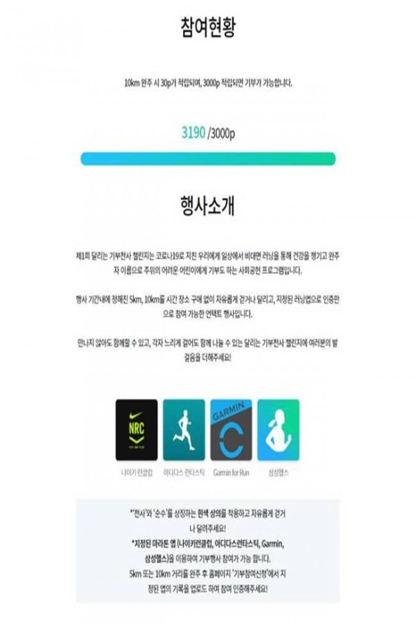 10km당 총 30포인트가 적립되며, 총 3,000포인트가 쌓이면 기부가 가능하다. 이미 지난 29일, 목표인 3,000포인트를 달성했고 주최측은 목표치의 200% 달성도 가능할 것으로 보고 있다. 챌린지 기간이 종료되면 마라톤 완주자 이름으로 취약계층 아동 300명에게 즉석밥과 비타민, 단백질 쉐이크 등이 포함된 ‘엔젤키트’(Angel kit)가 기부될 예정이다.