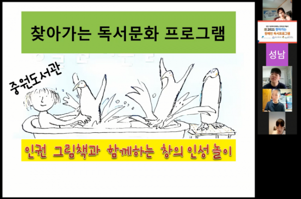 - 성남행복누리센터(센터장 김지현)는 코로나19로 인해 가정돌봄중인 이용인들의 정보·문화 격차 해소와 타인을 존중하고 공감하는 능력을 향상시키기 위해 중원도서관에서 주관하는 -2021년 찾아가는 장애인 독서문화 프로그램 지원 사업⸥을 비대면 온라인 수업으로 진행한다.
