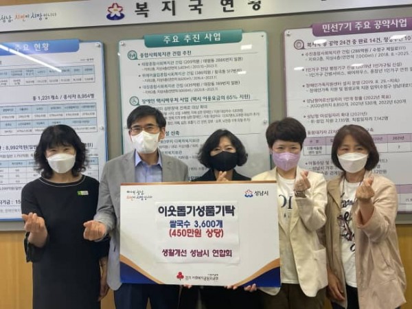 성남시는 이날 오후 3시 시청 5층 복지국장실에서 생활개선 성남시 연합회 대표와 정인목 성남시 복지국장 등이 참석한 가운데 사랑나눔 후원 물품인 쌀국수 기탁식을 가졌다.