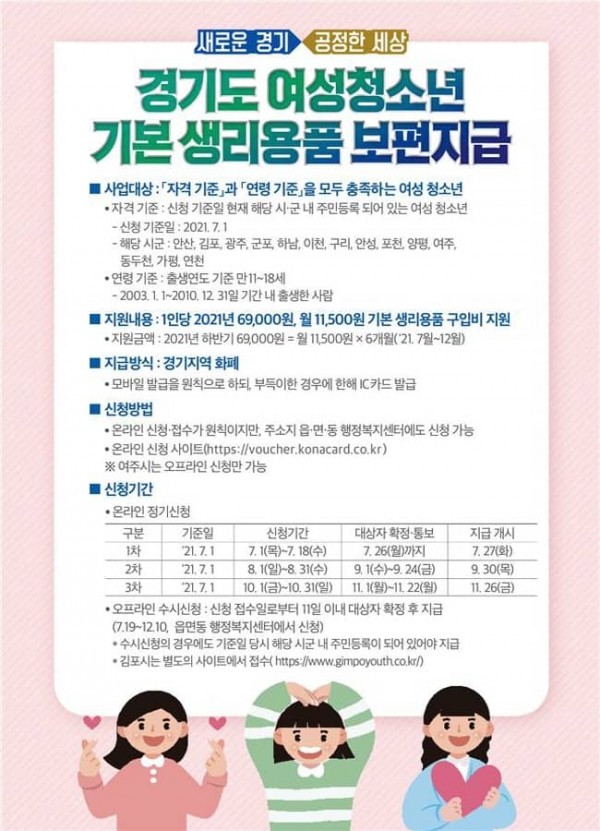 경기도가 지난 7~8월 ‘여성청소년 기본생리용품 보편 지원’ 1~2차 온라인 신청 기간을 놓친 여성청소년을 위해 3차 온라인 접수를 10월 한 달간 진행한다.