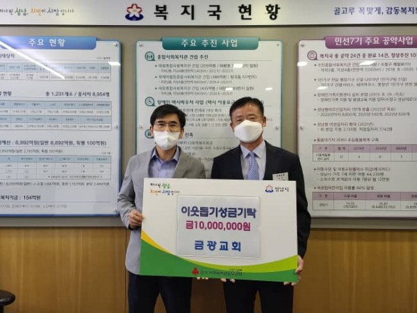 성남시 수정구 양지동에 위치한 금광교회는 2020년부터 수정구청과 중원구청, 시청에 1천만원 이상의 지원금을 기탁했으며 올해 추석명절에도 수정구청과 중원구청에 각각 1천만원을 기탁해 이번까지 2년째 6,500만원을 장학금, 코로나 물품 등의 용도로 사용되었으며 추석에는 홀몸노인, 장애인, 한부모가족 등에 전달됐다.