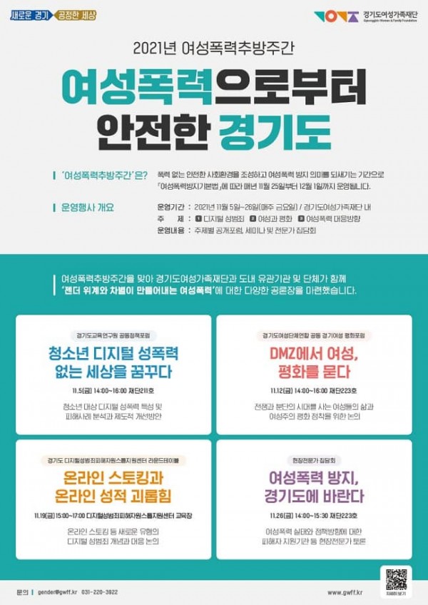 경기도여성가족재단이 ‘2021년 여성폭력추방주간’을 맞아 여성 폭력에 대한 공감대 확산을 위해 네 차례 기획행사를 개최한다.