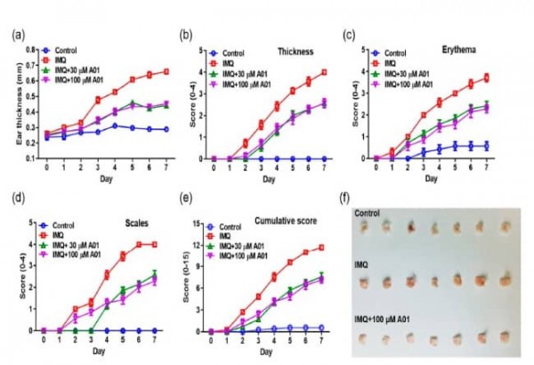 연구팀은 아녹타민1(ANO1)이 건선의 주요 증상인 각질형성세포의 과도한 증식을 유발하는 중요한 원인 단백질인 것을 밝혀냈고, 아녹타민1(ANO1) 이온채널 활성을 억제했을 때 발진, 홍반, 인설(하얀 각질) 등 건선의 주요증상과 건선을 일으키는 염증 유발 물질이 감소하는 결과를 확인했다.