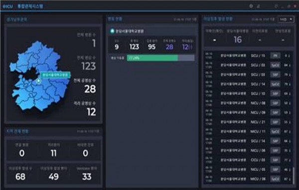 분당서울대병원은 국내 의료 환경을 고려해 원격 실시간 모니터링 및 비대면 협진시스템이 가능한 글로벌 수준의 한국형 e-ICU 시스템을 구축했다. 원내 중환자실 8개소를 연결해 실시간 모니터링을 가능하게 하는 ‘통합관제센터’를 통해 의료진이 각 중환자실의 통계 정보, 중환자 생체징후 등을 모니터링하며 협진할 수 있고, 응급상황 시 중요 알림을 제공받는다.