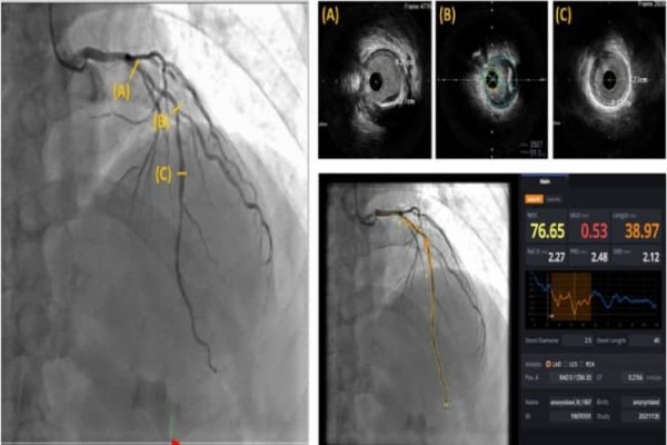사진1. 심혈관 조영술 영상(좌), 혈관 내 초음파(우-상), AI(우-하), 심혈관 조영술 영상을 바탕으로 AI가 각 부위(A~C) 병변의 길이 등을 분석해서 표시하고 있다.