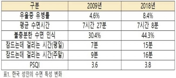 ■ 2009년, 2018년 무작위 추출 성인 대상 총 수면 시간, 수면의 질, 우울증 등 조사 및 분석