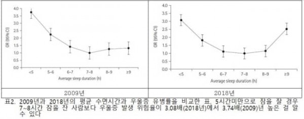 이번 연구는 국내 최초로 한국인을 대상 수면 특성 변화 연구로, 수면지속시간과 우울증의 연관성을 밝혔다는 점에서 연구 의의가 있다. 특히, 2009년과 2018년 모두 7~8시간 수면을 취한 사람의 우울증 유병률이 가장 낮았으며, 5시간 미만으로 수면을 취한 사람은 적정 수면시간을 취한 사람보다 3.08~3.74배 높았다. 아울러 9시간 이상 수면을 취하면 우울증 유병률이 1.32~2.53배 높은 것으로 나타나 적정 수면시간을 취하는 것이 매우 중요하다.